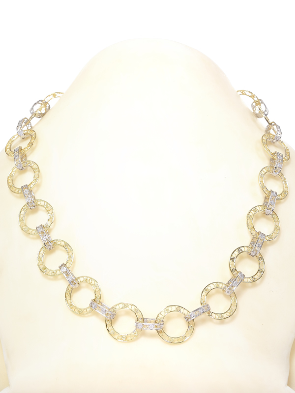 Collana in argento a catena con passanti in filigrana bicolore bianca / dorata, completa di chiusura a moschettone. Lavorazione artigianale ligure, le maglie tonde dorate sono unite tra loro da passanti in filigrana rodiata. La collana misura in lunghezza circa 50 cm.