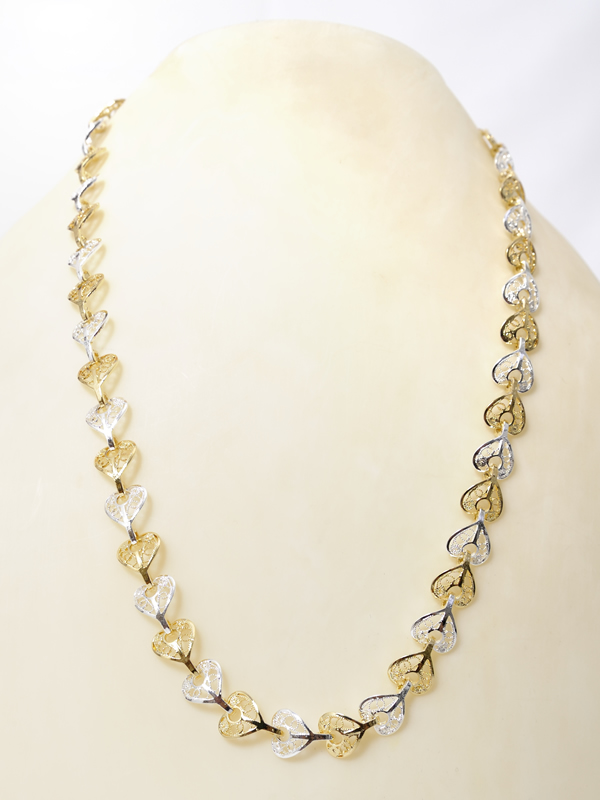 Collana in argento di cuoricini in filigrana bicolore bianca / dorata, i cuori sono ognuno agganciato all’altro, completa di chiusura a moschettone. Lavorazione artigianale ligure, disponibile anche tutta rodiata o tutta dorata. La collana misura in lunghezza circa 42,5 cm.