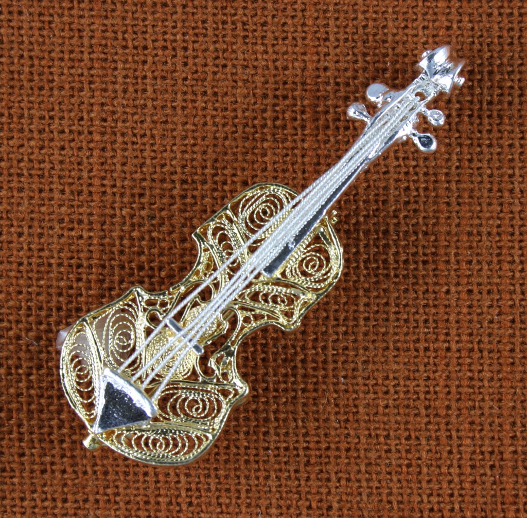 Spilla in argento raffigurante il Violino di Paganini in filigrana bicolore bianca / dorata e completo di spillone. Lavorazione artigianale ligure, il Violino di Paganini presso il nostro laboratorio è possibile trovarlo piccolo così da spilla oppure in diverse misure incorniciati per quadro oppure esposti su base di ardesia.
